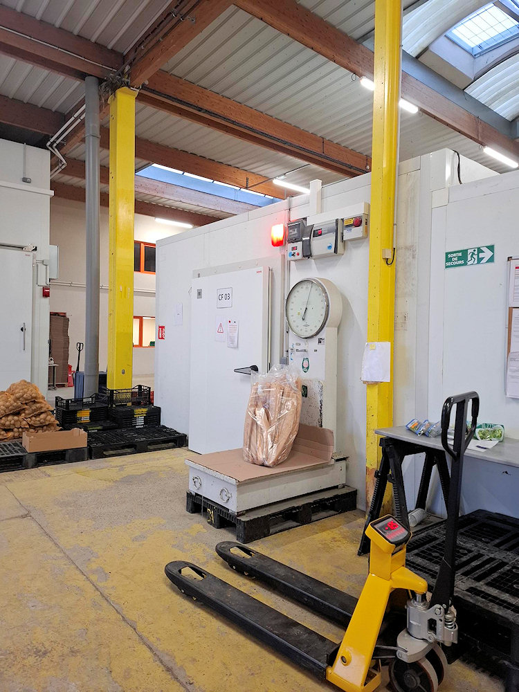 Le processus est le suivant : les marchandises arrivent et sont placées sur une palette pour être triées en fonction de la date et de l'état du produit.