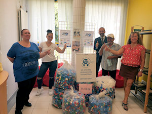 Prochain défi pour 2021 : doubler ce poids, avec plus de variétés de bouchons ! C'est nouveau : les bouchons de boissons + les bouchons de sirops, produit vaisselle, lessive liquide + les couvercles (beurre, NUTELLA, glace, crème, fromage...) sont acceptés.