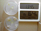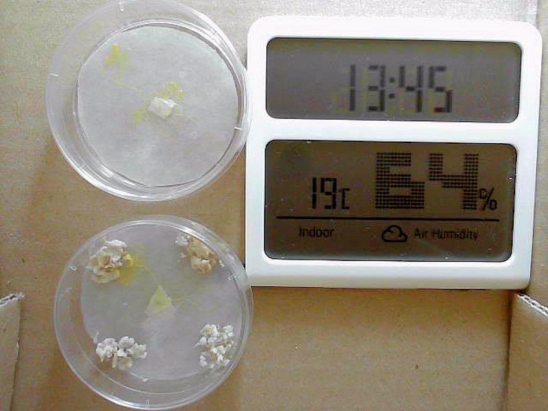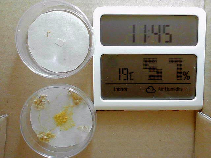 Le blob exploration (boite du haut) a été le premier à se réveiller au bout de 10 heures, puis il a patiemment fouillé toute sa boite pendant 5 jours à la recherche de nourriture. Le dernier jour, il s'est transformé en sclérote (état de dormance) à cause de son environnement défavorable : absence de nourriture et d'humidité (la boite ayant progressivement desséchée).