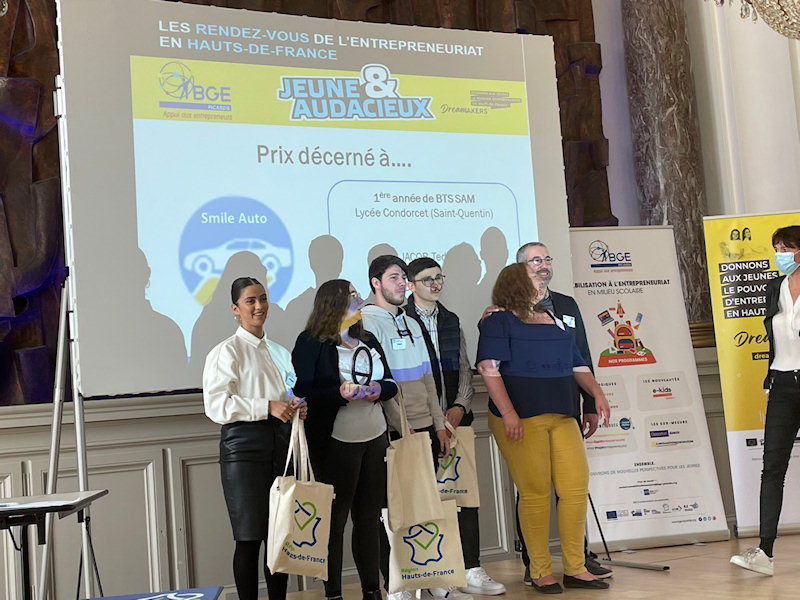 Les étudiants de BTS SAM 1, Mélisande, Roman, Soukaina et Teddy ont été mis à l'honneur. Ils sont lauréats du prix coup de cœur du jury avec leur projet Smile Auto, prix remis par Madame MACAREZ, Maire de Saint-Quentin.