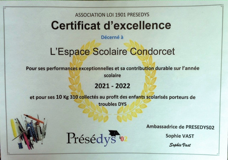 Le 8 juin 2022, Monsieur JC STORZ, Proviseur de l'ESPACE SCOLAIRE CONDORCET (ESC), a eu le plaisir de recevoir Sophie VAST et une bénévole, Membres de l'Association Présédys02, dont l'objet consiste à aider les enfants scolarisés porteurs de troubles DYS.