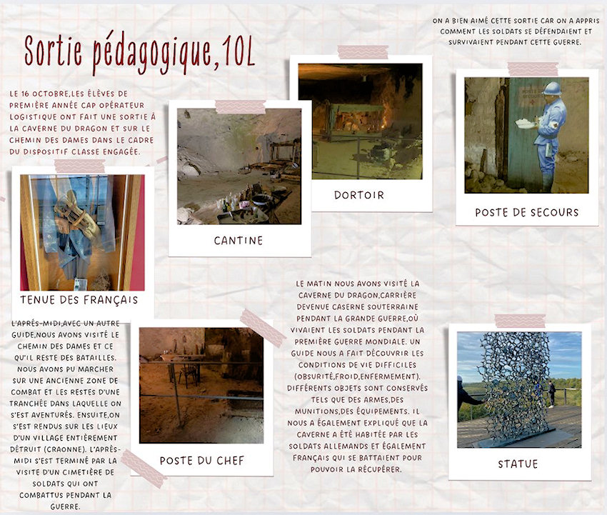 Le 16 octobre, les élèves de 1ère année de CAP Opérateur Logistique ont fait une sortie à la Caverne du Dragon et sur le Chemin des Dames, dans le cadre du dispositif Classe Engagée.