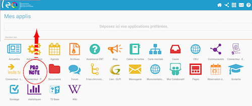 Cliquez sur Applications en page d'accueil pour accéder au connecteur "Pronote". Vous pourrez aussi glisser le connecteur Pronote dans "mes applis" pour un accès plus rapide à l'avenir.